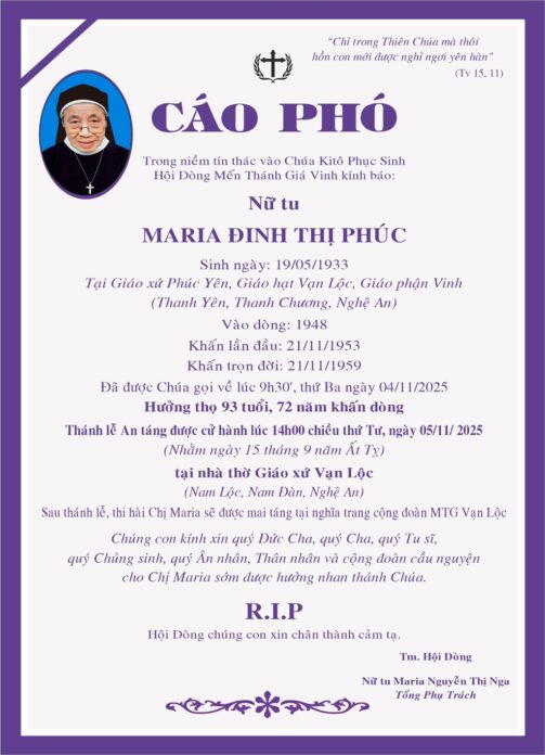 Cáo phó: Nữ tu Maria Đinh Thị Phúc (Cộng đoàn Vạn Lộc – Hội dòng Mến Thánh Giá Vinh)