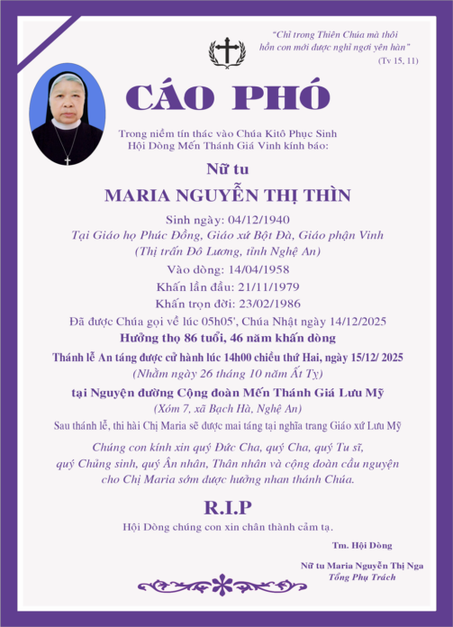 Cáo phó: Nữ tu Maria Nguyễn Thị Thìn (Cộng đoàn Lưu Mỹ – Hội dòng Mến Thánh Giá Vinh) 14 Tháng 12, 2025 Share FacebookTwitterWhatsAppEmailPrintViber