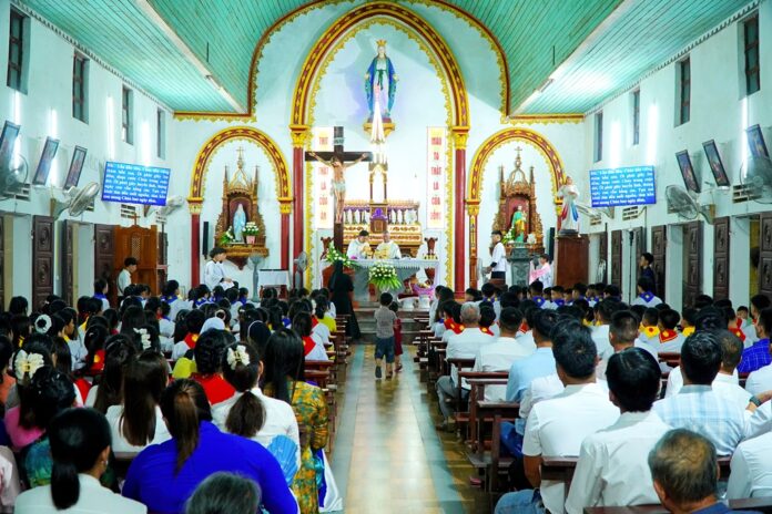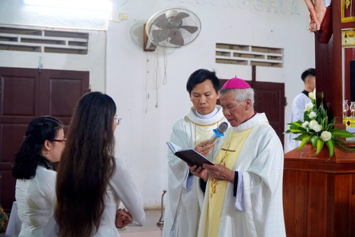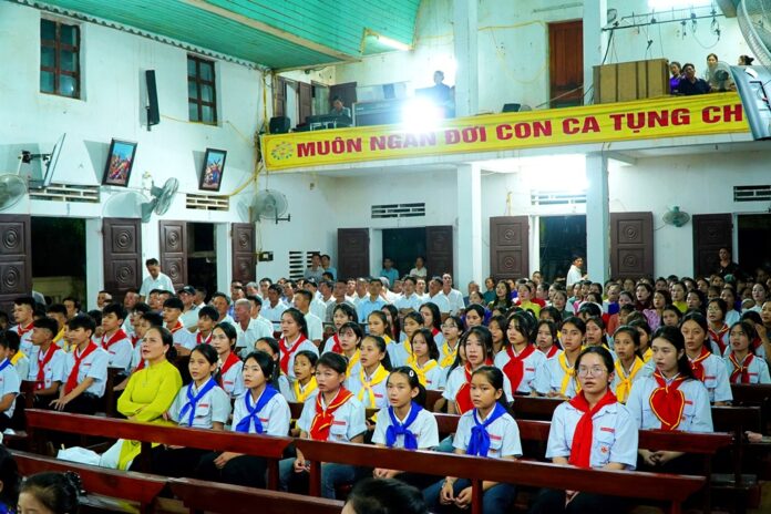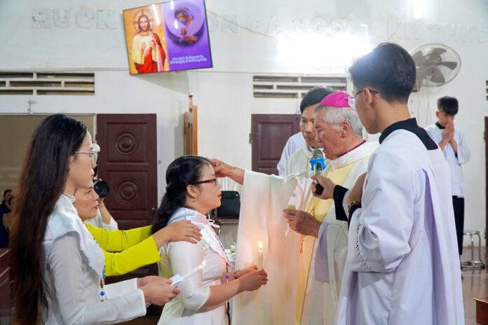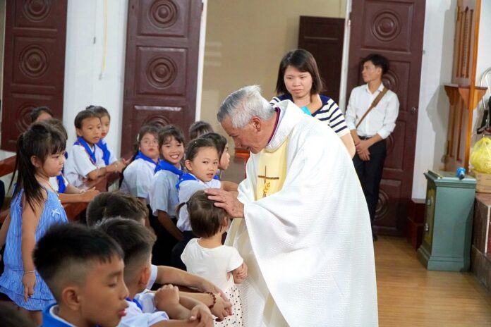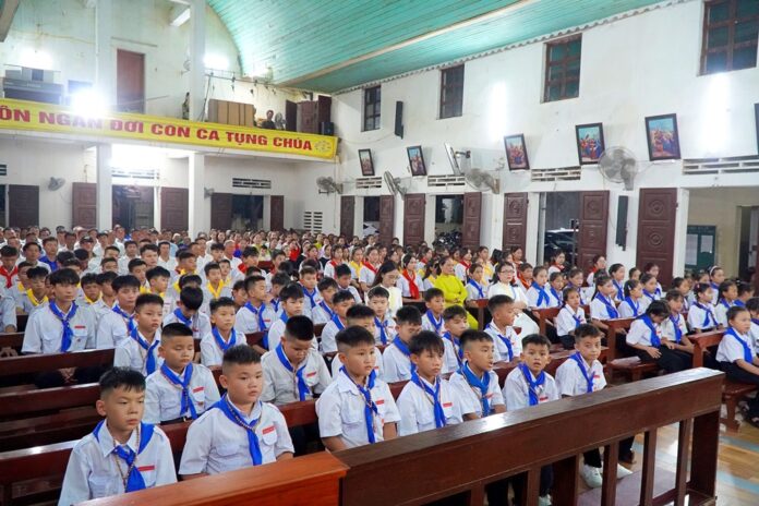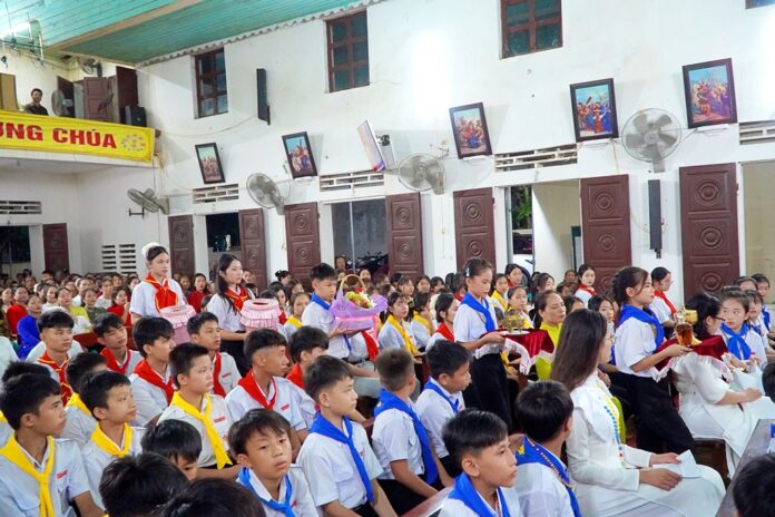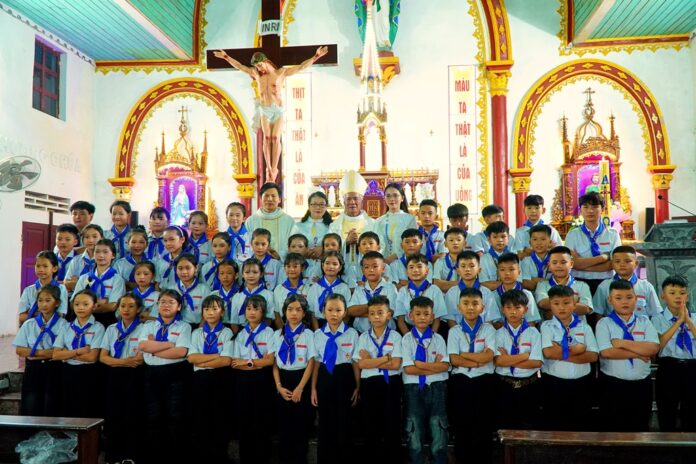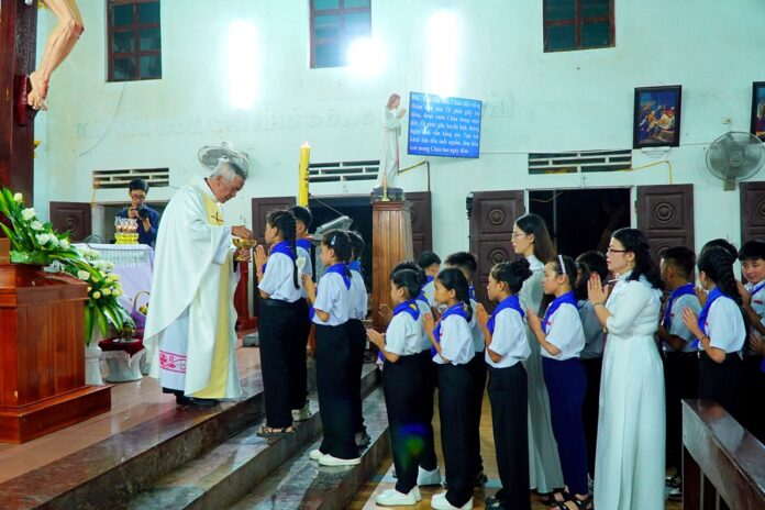 GPVO (06/09/2025) – Vào lúc 19 giờ 30 phút ngày 04/09/2025, giáo xứ Nhật Quang hân hoan chào đón Đức Giám mục giáo phận Anphong Nguyễn Hữu Long viếng thăm và cử hành thánh lễ cho 52 thiếu nhi thuộc lớp xưng tội rước lễ lần đầu, đồng thời cử hành các nghi thức khai tâm Kitô giáo cho hai tân tòng. Đồng tế và hiệp dâng thánh lễ có cha quản xứ Giuse Nguyễn Văn Hồ, quý tu sĩ cùng cộng đoàn dân Chúa.