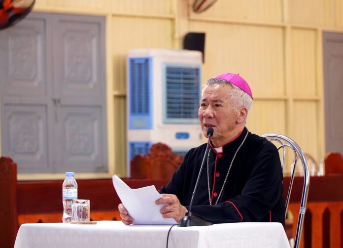 Vào lúc 14 giờ, sau khi lần chuỗi Mân Côi kính Đức Mẹ, các tham dự viên đã được lắng nghe bài chia sẻ của Đức cha chủ chăn giáo phận. Ngỏ lời với cộng đoàn hiện diện, Đức cha Anphong đã có lời khen ngợi, động viên và khích lệ tinh thần sống đức tin mạnh mẽ của các tín hữu được thể hiện qua sự tham gia cách nhiệt thành vào các các hội đoàn Công Giáo tiến hành đang hoạt động tại các giáo xứ. Bên cạnh đó, Đức cha cũng mời gọi các tham dự viên biết ý thức và sống quảng đại hơn nữa qua việc thực hành các công việc bác ái để giúp đỡ những anh chị em chung quanh. Cuối cùng, Đức cha nhấn mạnh đến vai trò và bổn phận của các hội đoàn cũng như của các thành viên đối với sứ mạng loan báo Tin Mừng của Giáo hội, cách riêng là trong giáo phận nhà.