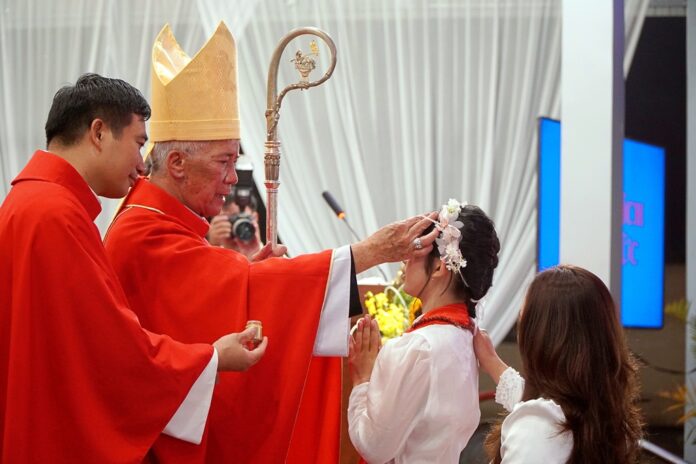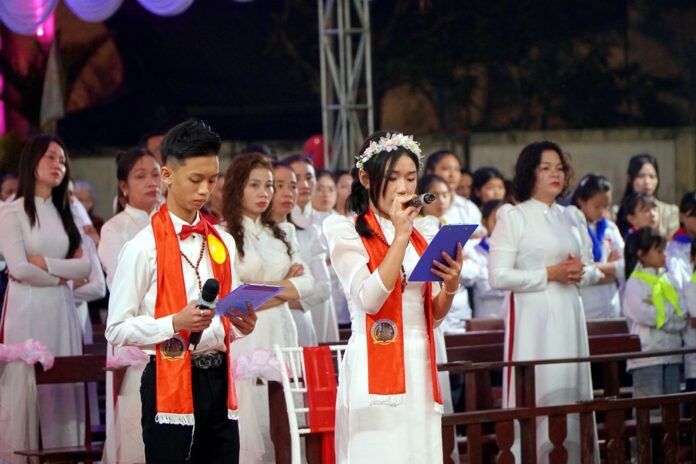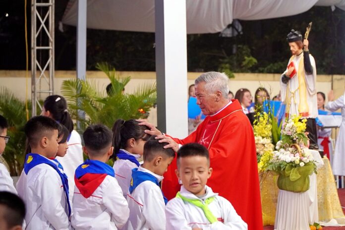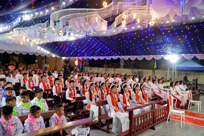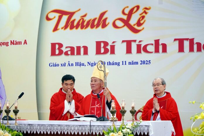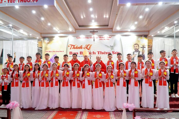 GPVO – Vào lúc 19 giờ 30 phút ngày 01/12/2025, trong tâm tình đón mừng ngày lễ kính thánh bổn mạng Phanxicô Xaviê, giáo xứ Ân Hậu hân hoan chào đón Đức Giám mục giáo phận Anphong Nguyễn Hữu Long viếng thăm và cử hành thánh lễ ban bí tích Thêm Sức cho 29 thiếu niên của giáo xứ. Đồng tế và hiệp dâng thánh lễ có cha quản xứ Giuse Vương Văn Đỉnh, cha G.B. Nguyễn Trung Kiên – giáo sư Đại Chủng viện thánh Phanxicô Xaviê, quý tu sĩ cùng cộng đoàn dân Chúa.