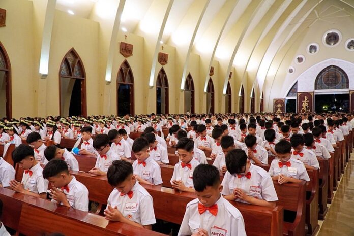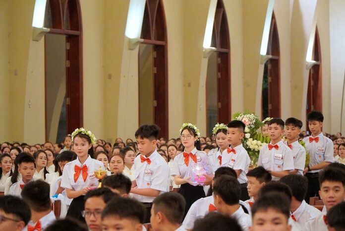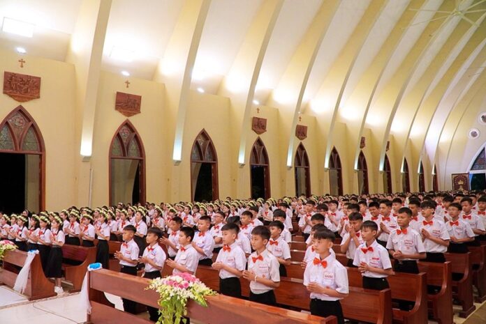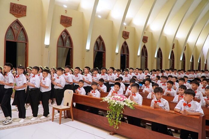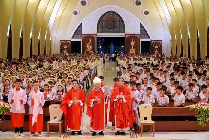 GPVO (21/08/2025) – Vào lúc 19 giờ 30 phút ngày 19/08/2025, Đức Giám mục Giáo phận Anphong Nguyễn Hữu Long đã viếng thăm và cử hành thánh lễ ban bí tích Thêm Sức cho 166 thiếu niên của giáo xứ Yên Đại. Đồng tế và hiệp dâng thánh lễ có cha quản xứ Giuse Phạm Đình Trị, cha quản hạt Cầu Rầm G.B. Hoàng Xuân Lập, quý tu sĩ cùng cộng đoàn dân Chúa.