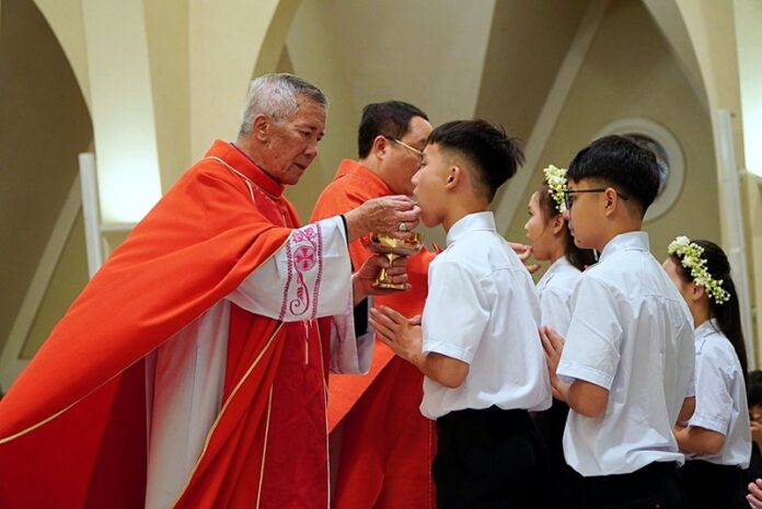 Sau phần giảng lễ, Đức cha Anphong đã cử hành nghi thức ban bí tích Thêm Sức cho các em qua ba phần: Tuyên xưng đức tin – Nghi thức đặt tay – Xức dầu thánh và Chúc bình an, giúp các em hoàn thiện quá trình khai tâm Kitô giáo.