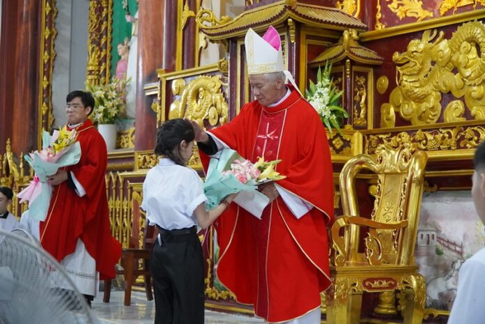Sau bài giảng lễ, Đức Giám mục Anphong đã cử hành nghi thức ban bí tích Thêm Sức cho các em thiếu niên. Nghi thức mở đầu với phần tuyên xưng đức tin, qua đó, các em lặp lại lời hứa khi chịu phép Rửa Tội. Tiếp đến là nghi thức đặt tay cùng lời nguyện của Đức Giám mục để khẩn cầu Thiên Chúa ban Chúa Thánh Thần cùng các ơn của Người xuống trên các em. Cuối cùng là việc Xức dầu thánh và chúc bình an.