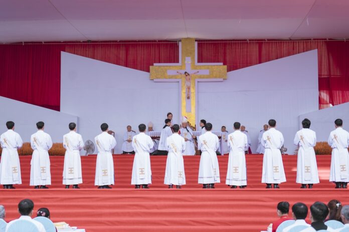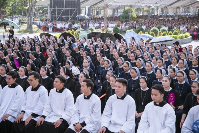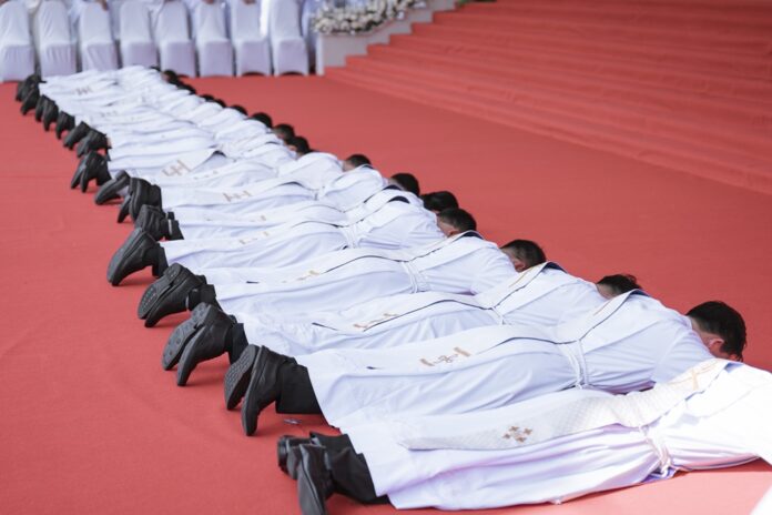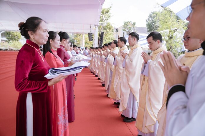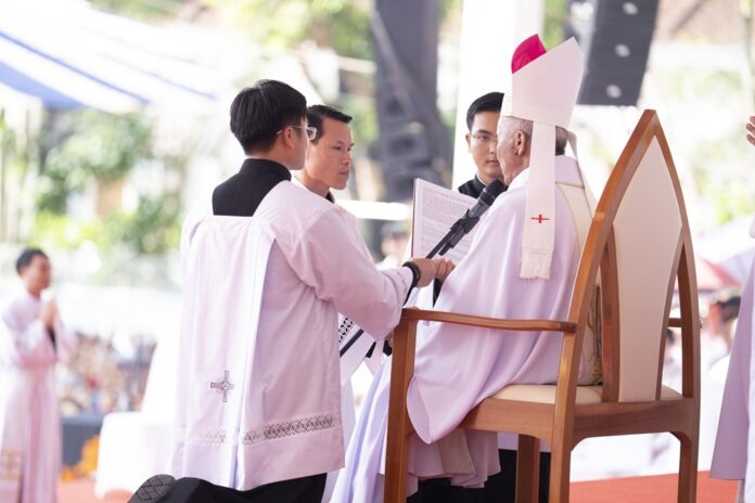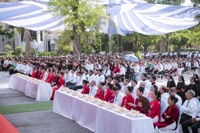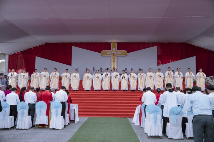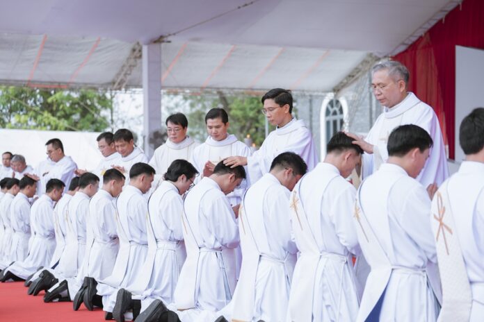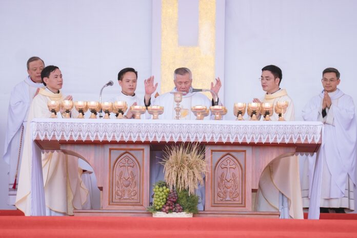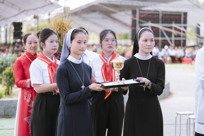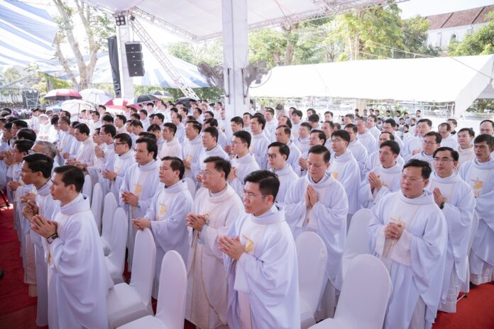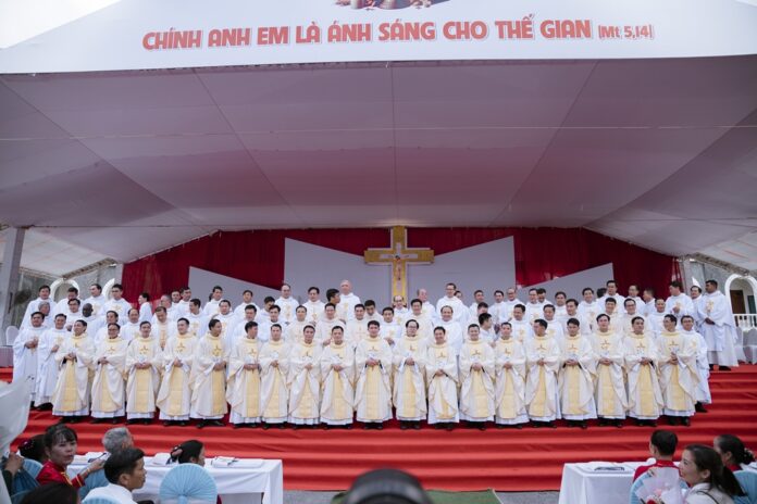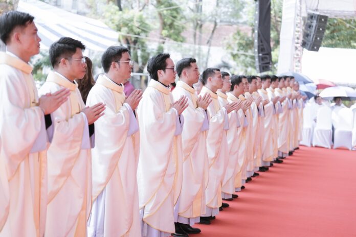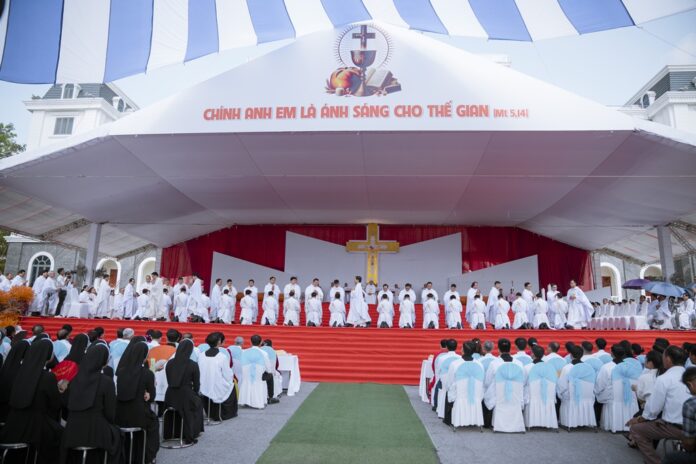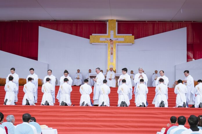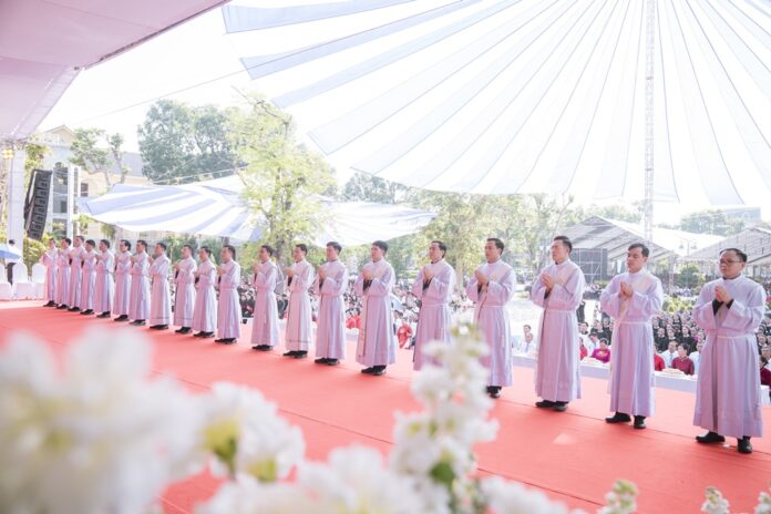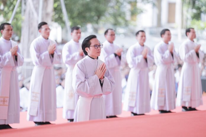 GPVO (23/09/2025) – Vào 8 giờ sáng ngày 22/09/2025, tại quảng trường Trung tâm Mục vụ Giáo phận Vinh, Đức Giám mục giáo phận Anphong Nguyễn Hữu Long đã long trọng cử hành thánh lễ truyền chức linh mục cho 20 thầy phó tế bao gồm 17 tiến chức thuộc Đại Chủng viện Thánh Phanxicô Xaviê, 02 tiến chức thuộc dòng Truyền giáo thánh Carôlô Scalabrini và 01 tiến chức thuộc Tu Đoàn Thừa Sai Các Thánh Tông Đồ. Đồng tế và hiệp dâng thánh lễ có Đức Giám mục phụ tá Phêrô Nguyễn Văn Viên, cha Tổng Đại diện giáo phận Vinh Phêrô Nguyễn Văn Vinh, cha Tổng Đại diện giáo phận Hà Tĩnh Gioan Baotixita Nguyễn Khắc Bá, Đức ông Phêrô Nguyễn Chí Thiết, quý cha Tòa Giám mục, quý cha Đại Chủng viện Thánh Phanxicô Xaviê, đông đảo quý cha trong và ngoài giáo phận, quý chủng sinh, nam nữ tu sĩ, quý thân, ân nhân của các tiến chức cùng cộng đoàn dân Chúa.